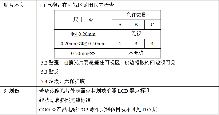 黑點(diǎn)、白點(diǎn)、污物、劃傷、內(nèi)劃傷、針孔、貼片不良、外劃傷、破損、玻璃殘留、尺寸不良、封口不良、定位不良、盒內(nèi)氣泡、邊框膠不良、彩虹(可是區(qū)域內(nèi))、底色不良、保護(hù)層不良、裝PIN不良、絲印不良、FPC不良、TCP不良、焊接不良、阻容件錯位等。